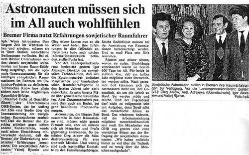 С фирмой ОХБ Системз, Бремен было заключено соглашение о консультациях в области длительного пребывания человека в условиях микрогравитации на нашей орбитальной станции Салют, по которому в Германию прибыли наши космонавты Валерий Рюмин и Олег Атьков. Используя их приезд, наша фирма, помимо 3-дневных консультаций в Бремене, за свой счет организовала их встречу с немецкими правительственными организациями по исследованиям в области авиации и космонавтики – ДАРА и ДЛР.