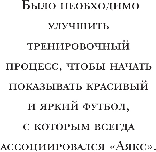 Было необходимо улучшить тренировочный процесс, чтобы начать показывать красивый и яркий футбол, с которым всегда ассоциировался «Аякс». Нам нужно было сообща работать над этим, сохраняя в клубе мир, и внимательно отслеживать развитие всех участников процесса, а также определять, кто не соответствует уровню и кому нужно изменить свой подход к игре. И главное – каждый должен был помнить, что всё, что он делает, должно делаться в интересах «Аякса».
