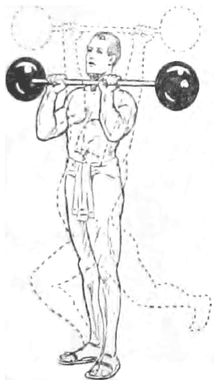 Вытолкнутый вес следует несколько секунд продержать на вытянутых руках. Это упражнение, как и другие, о которых я уже говорил, проделывается весьма различно, в зависимости от того, как это принято в различных странах.