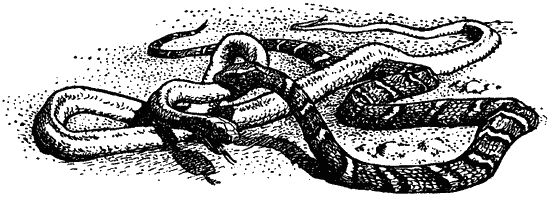 В этот одиннадцатый и последний вечер провожал меня Ибботсон. Приблизившись к Голабраи, мы увидели людей, стоявших на обочине дороги и смотревших вниз на поле, находившееся на небольшом расстоянии от мангового дерева. Люди нас не заметили, и прежде чем мы подошли к ним, они повернулись и пошли по направлению к убежищу паломников. Однако один из них посмотрел назад и, увидев, что я кивнул ему, возвратился. В ответ на наш вопрос он сказал, что вместе со своими спутниками в течение целого часа смотрел на грандиозную битву между двумя большими змеями внизу на заброшенном поле. В последний раз за ними можно было наблюдать поблизости от большой скалы в середине поля. На этой скале виднелись пятна крови. Человек сказал, что это кровь змей, покусавших друг друга. Сломав ветку с ближайшего куста и пользуясь ею как палкой, я спрыгнул вниз на поле, чтобы посмотреть, имеются ли какие отверстия около скалы, и, разглядывая почву, заметил обеих змей, лежавших в кустах чуть ниже дороги. В это время и Ибботсон тоже вооружился основательной палкой, и, когда одна из змей попыталась вылезти на дорогу, он ее убил. Другая же скрылась в отверстии около бугра, откуда нам было трудно ее выгнать. Змея, которую убил Ибботсон, оказалась около семи футов длиной, однотонного светло-соломенного цвета; на ее шее виднелось несколько следов от укусов. Это не был полоз; увидев ее заметно выдававшиеся ядовитые зубы, мы пришли к заключению, что это какая-то разновидность бескапюшонной кобры. Холоднокровные животные также восприимчивы к змеиному яду. Я видел лягушку, ужаленную коброй и умершую через несколько минут, однако мне не было известно, могут ли отравить друг друга змеи одной и той же разновидности. Возможно, что та, которая скрылась в отверстии, умерла через несколько минут, но, может быть, она осталась в живых и умрет в глубокой старости.
