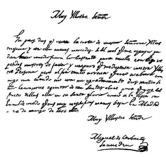 Последнее письмо Сервантеса, написанное в предчувствии близкой смерти и адресованное архиепископу Сандовалю 26 марта 1616 года. Сейчас доказано, что это фальсификация.