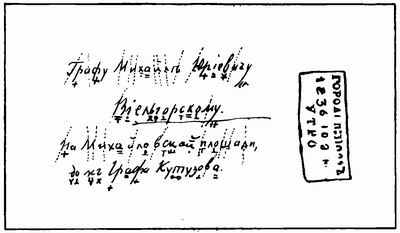 Адрес, написанный на оборотной стороне пасквиля, вложенного в конверт на имя графа Виельгорского