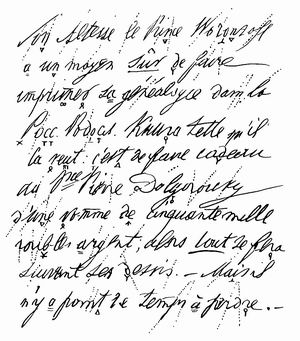 Шантажное письмо князю М. С. Воронцову (Писано кн. П. В. Долгоруковым изменённым почерком. Извлечено из книги «Procès du prince Worontzow contre le prince Pierre Dolgoroukow». Leipzig, 1862)