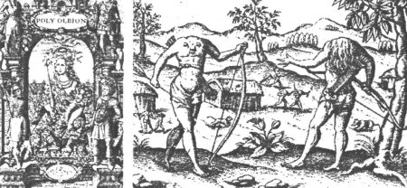В то время как титульный лист Дрейтона (слева) демонстрирует привычные всем фигуры с одной головой, на соседней гравюре мы видим, что, вопреки клятвенным заверениям моряков, якобы видевших трехголовых людей, обитатели Новой Гвинеи вообще не имели головы