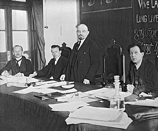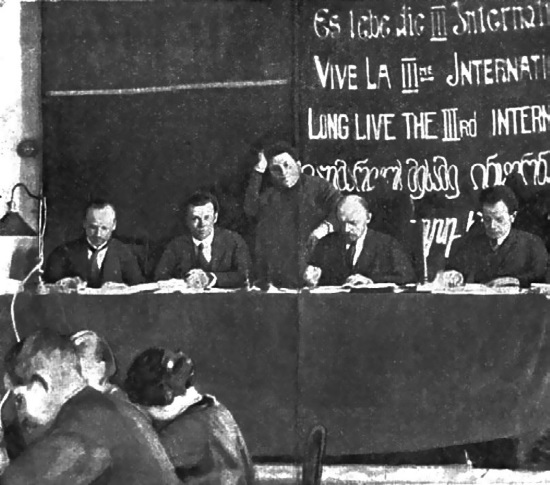 В Президиуме Первого конгресса Коминтерна. Слева направо: Г. Клинкер, Г. Эберляйн, Г. Е. Зиновьев, В. И. Ленин, Ф. Платтен. В 1930-е годы Зиновьева, как врага народа, с этой фотографии удалят.