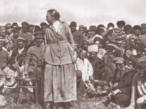 Надежда Константиновна выступает на митинге во время поездки на пароходе «Красная звезда». 1919 г.