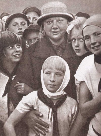 Крупская среди пионеров — детей рабочих кирпичного завода им. Л. М. Книпович. Станция Лобня под Москвой, 1928 г.