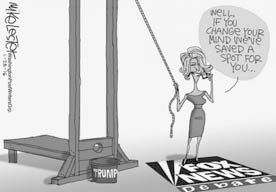 Карикатура на дебаты: Мегин Келли говорит по телефону «Ну, если вы передумаете, мы оставим для вас местечко». Надпись на ведре у гильотины: «Трамп»