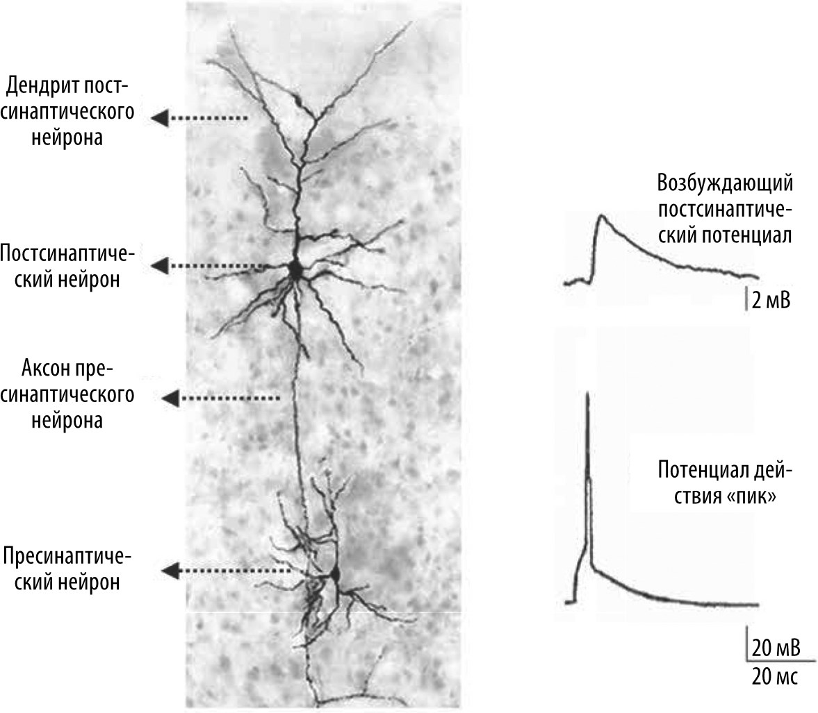 Рис. 2.1. Нейроны и синапсы. Изображение двух корковых нейронов. Аксон нижнего пресинаптического нейрона соединяется с дендритом верхнего постсинаптического нейрона через синапс (не виден). Потенциал действия — быстрый «всплеск» напряжения — в пресинаптическом нейроне вызывает небольшое увеличение напряжения постсинаптического нейрона (так называемый возбуждающий постсинаптический потенциал, EPSP). (Изменено с разрешения Feldmeyer et al., 2002)