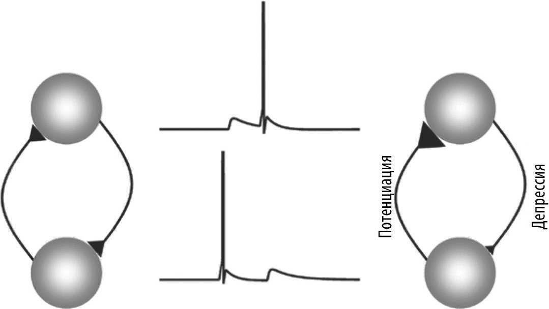 Рис. 2.2. Модель пластичности, зависимой от времени импульса (STDP). Два нейрона взаимосвязаны посредством двух синапсов (черные треугольники). Если нижний нейрон постоянно возбуждается раньше верхнего, синапс от нижнего нейрона к верхнему будет усиливаться (потенциация синаптической передачи), а синапс от верхнего нейрона к нижнему будет ослабевать (депрессия синаптической передачи).