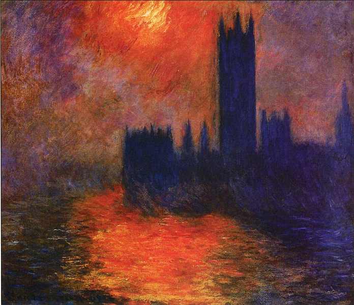 В 1900–1904 Клод Моне неоднократно бывал в Англии, он любил Лондон за неповторимую туманную атмосферу. Здесь живописен много раз писал здание парламента, создав целую серию работ на эту тему. «Здание парламента в Лондоне» (1904, музей д'Орсе, Париж) словно окутано густым туманом, сквозь который проступают величественные очертания неоготической архитектуры и пробивается желто-рыжее солнце, окрашивающее Темзу рыжевато-багровыми бликами. Живопись условна, художник изображает не конкретные детали, а именно сиюминутный образ города, каким он его увидел. Импрессионизм Моне не передает объективной реальности, не признает неизменности качеств предметов. Их цвет, а также очертания зависят от света — едва пробивающегося, заливающего всю окрестность, или гаснущего, переходящего в сумерки.