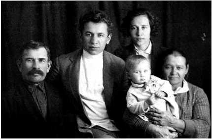 Студент Института красной профессуры С.Н. Круглов с отцом Никифором Яковлевичем, матерью Любовью Игнатьевной, женой Таисией Дмитриевной и дочерью Ириной. 1936 год.