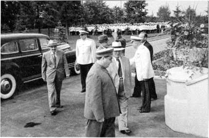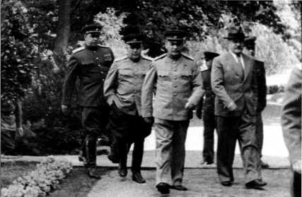 Ответственный за охрану Потсдамской конференции генерал-полковник С.Н. Круглов, министр иностранных дел СССР В.М. Молотов, заместитель Главнокомандующего группой Советских войск в Германии генерал армии В.Д. Соколовский, нарком внутренних дел СССР маршал Л.П. Берия, заместитель Главноначальствующего Советской военной администрации в Германии генерал-полковник И.А. Серов и другие лица осматривают «объекты специального назначения». 15 июля 1945 года.