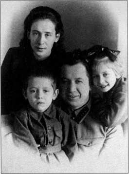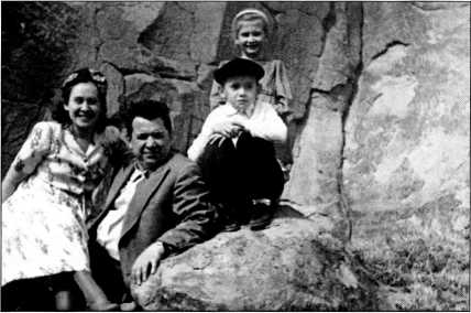 После возвращения семьи из эвакуации. Сергей Никифорович с женой Таисией Дмитриевной, сыном Валерием и дочерью Ириной. 1943 год.