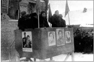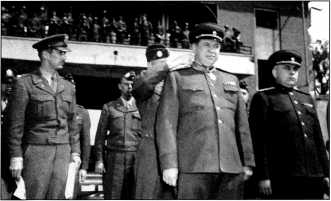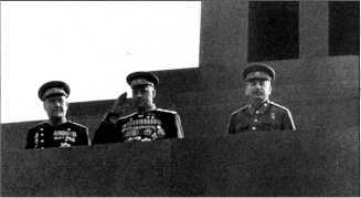 Маршалы Советского Союза Н.А. Булганин, К.К. Рокоссовский и Генералиссимус И.В. Сталин на трибуне Мавзолея Ленина.