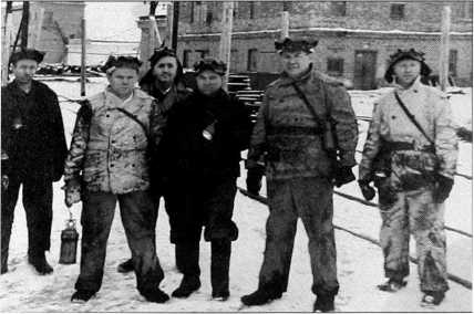Министр внутренних дел СССР С.Н. Круглов (второй справа) и его секретарь Н.А. Цыпленков (крайний справа) после выхода из воркутинской шахты.