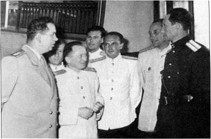 В кулуарах Потсдамской конференции. Июль 1945 года. Маршал Г.К. Жуков и другие советские военачальники беседуют с представителями союзных армий. Левее Г.К. Жукова — генерал-полковник С.Н. Круглов. На переднем плане: нарком иностранных дел СССР В. М.Молотов, премьер-министр Великобритании К. Эттли, президент США Г. Трумен, председатель Совнаркома СССР И.В. Сталин На заднем плане справа: генерал-полковник С.Н. Круглов.