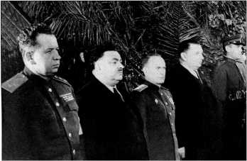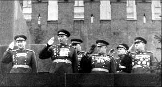 Генерал-полковник С.Н. Круглов и Маршалы Советского Союза И.С. Конев, Г.К. Жуков, А.М. Василевский на нижней трибуне Мавзолея В.И. Ленина.