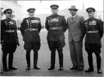 После парада и демонстрации трудящихся на Красной площади: заместитель министра внутренних дел СССР и начальник Управления МВД по Московской области генерал-лейтенант Н.К. Богданов, начальник Главного управления милиции МВД СССР генерал-лейтенант А.М. Леонтьев, министр внутренних дел СССР генерал-полковник С.Н. Круглов, не установленное лицо в гражданской одежде, первый заместитель министра внутренних дел СССР генерал-полковник И.А. Серов. 1 мая 1949 года.