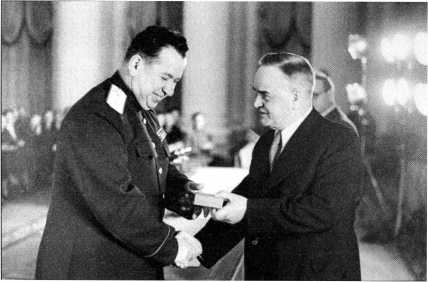 За прекрасное обеспечение Потсдамской конференции советские руководители охраны были удостоены наград США и Великобритании. На снимке: вручение генерал-полковнику С.Н. Круглову американской награды «За большие заслуги (Командорской степени)». Правее стоит полковник М.М. Корецкий, удостоенный такой же награды (Легионерской степени). Июль 1945 года.