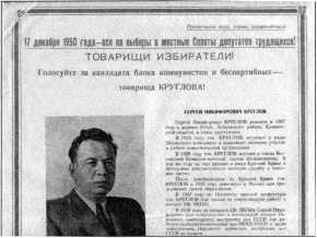 Агитационный плакат, знакомивший с биографией и призывавший голосовать за С.Н. Круглова — кандидата в депутаты Московского городского Совета депутатов трудящихся по избирательному округу № 400 Дзержинского района города Москвы. Декабрь 1950 года.