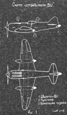 Схема расположения реактивной установки на самолете-истребителе ВИ, предложенном С. П. Королевым в 1944 году.