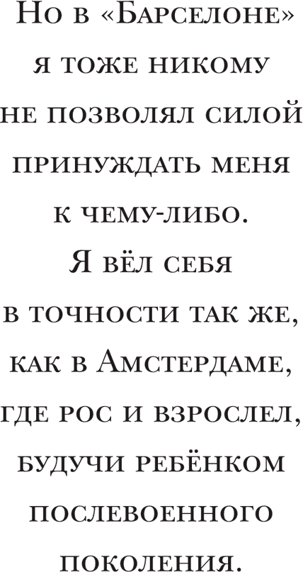 Но в «Барселоне» я тоже никому не позволял силой принуждать меня к чему-либо. Я вёл себя в точности так же, как в Амстердаме, где рос и взрослел, будучи ребёнком послевоенного поколения. Все в нём находились под влиянием Beatles, которые отличались ото всех и всегда делали всё по-своему. Я поступал так же на поприще спорта и футбола. Это шло вразрез с теми представлениями, по которым тогда жила Каталония. Люди, жившие в провинции, выражали самый широкий спектр мнений, в которых я хотел разобраться, но, даже несмотря на то, что часто думал о них, я все равно не мог понять их.