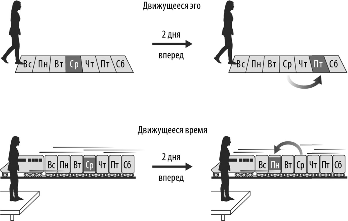 Возможно, вам приходилось раздумывать над смыслом фразы типа: Заседание следующей среды перенесено на два дня. Что вы делаете в таком случае? Идете на заседание в понедельник или в пятницу? Слово «перенесено» вполне может подразумевать «удалено от нас», т. е. передвинуто вперед. Таким образом, если вы движетесь по неподвижной линии времени, и встреча перенесена вперед, следовательно, она назначена на пятницу. Но если вы стоите неподвижно и наблюдаете за течением времени, перенос заседания на два дня означает, что оно произойдет «ближе к вам», т. е. в понедельник. Первый сценарий (пятница) описывается в рамках модели движущегося эго, второй (понедельник) — в рамках модели движущегося времени (рис. 10.1).
