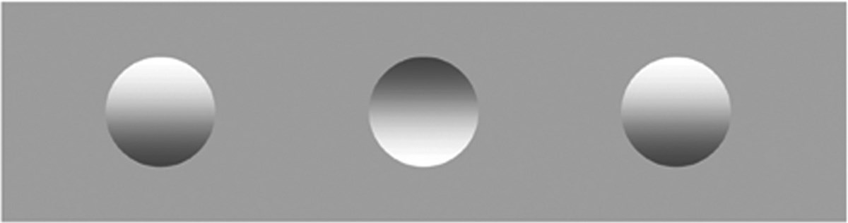 Средний из трех кругов на рисунке кажется нам выпуклым (как бы выступающим над плоскостью страницы), тогда как два других выглядят вогнутыми (как бы вдавленными в страницу; а если вы перевернете страницу вверх ногами, все окажется наоборот: центральный круг будет вогнутым, а два других выпуклыми). Эта иллюзия возникает из-за того, что с самого момента рождения человека система восприятия зрительных образов собирает статистику и устанавливает, что свет обычно идет сверху, так что бугор на стене затенен снизу, а впадина — сверху.