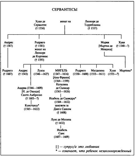 Родословная Сервантеса тоже весьма туманна, еще сложнее вычленить и проследить прямую ветвь рода писателя. Разветвленность рода Сервантесов необычайно велика. Фамилии Сервантес и Сервантес Сааведра появляются с очень давних времен и встречаются во всех регионах Испании, их можно обнаружить в Талавера де ла Рейна и Вальядолиде, Гранаде и Толедо, Кордове. Даже в родном городе Мигеля де Сервантеса — Алькала-де-Энарес в книге крещений церкви Санта Мария, где был записан Мигель, мы находим некоего Диего де Сервантеса (Zerbantes), еще Хуана, сына Хуана де Сервантеса (дяди писателя), а также лиценциата Сааведру.